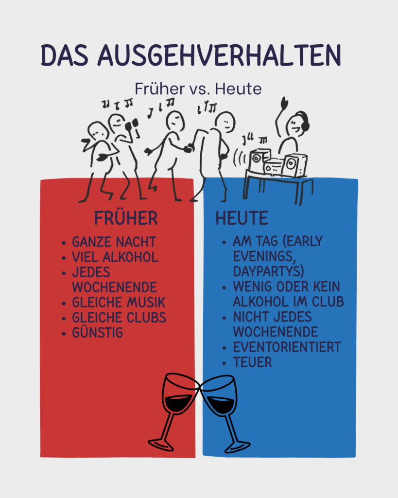 Für die Betriebe bedeutet weniger Alkohol auch weniger Umsatz: Rund 60 Prozent der Clubeinnahmen stammen aus dem Barbetrieb. Gleichzeitig wächst eine Generation heran, die Clubs kaum mehr kennt, und lieber bruncht, wandert oder Spieleabende macht.